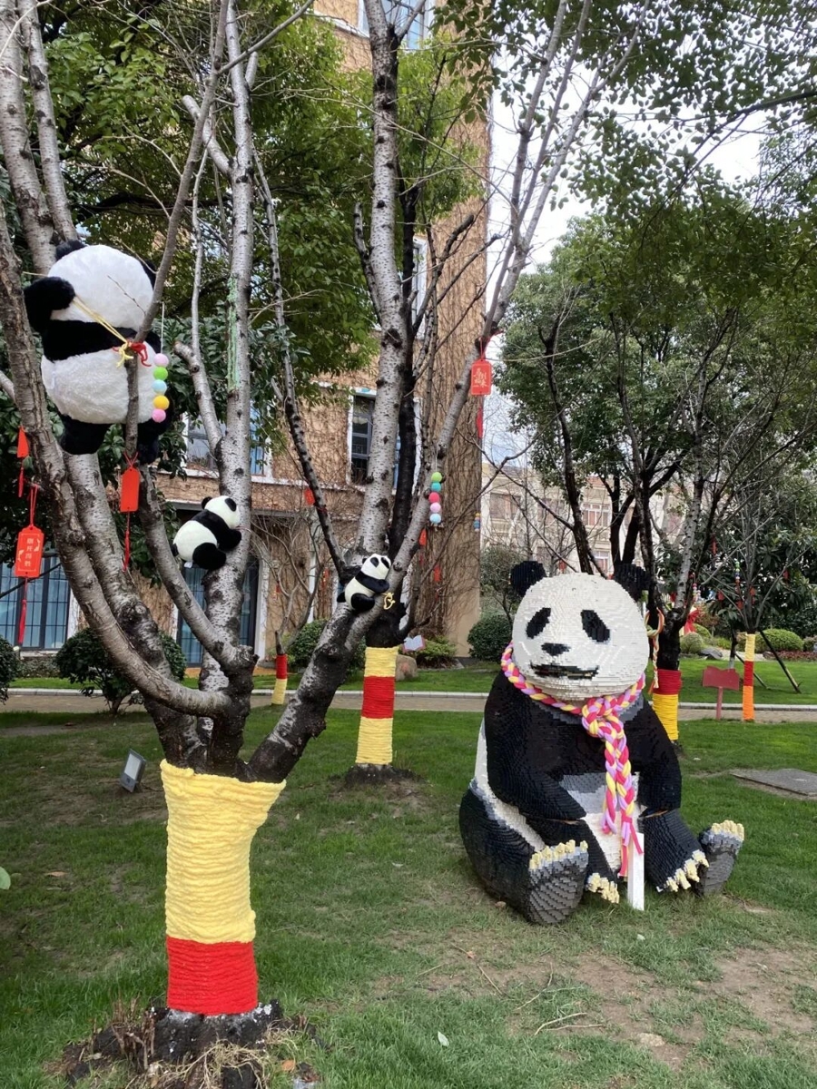 向明中学的校园树木也悄然换上了“新装”,树干缠绕着喜庆装饰